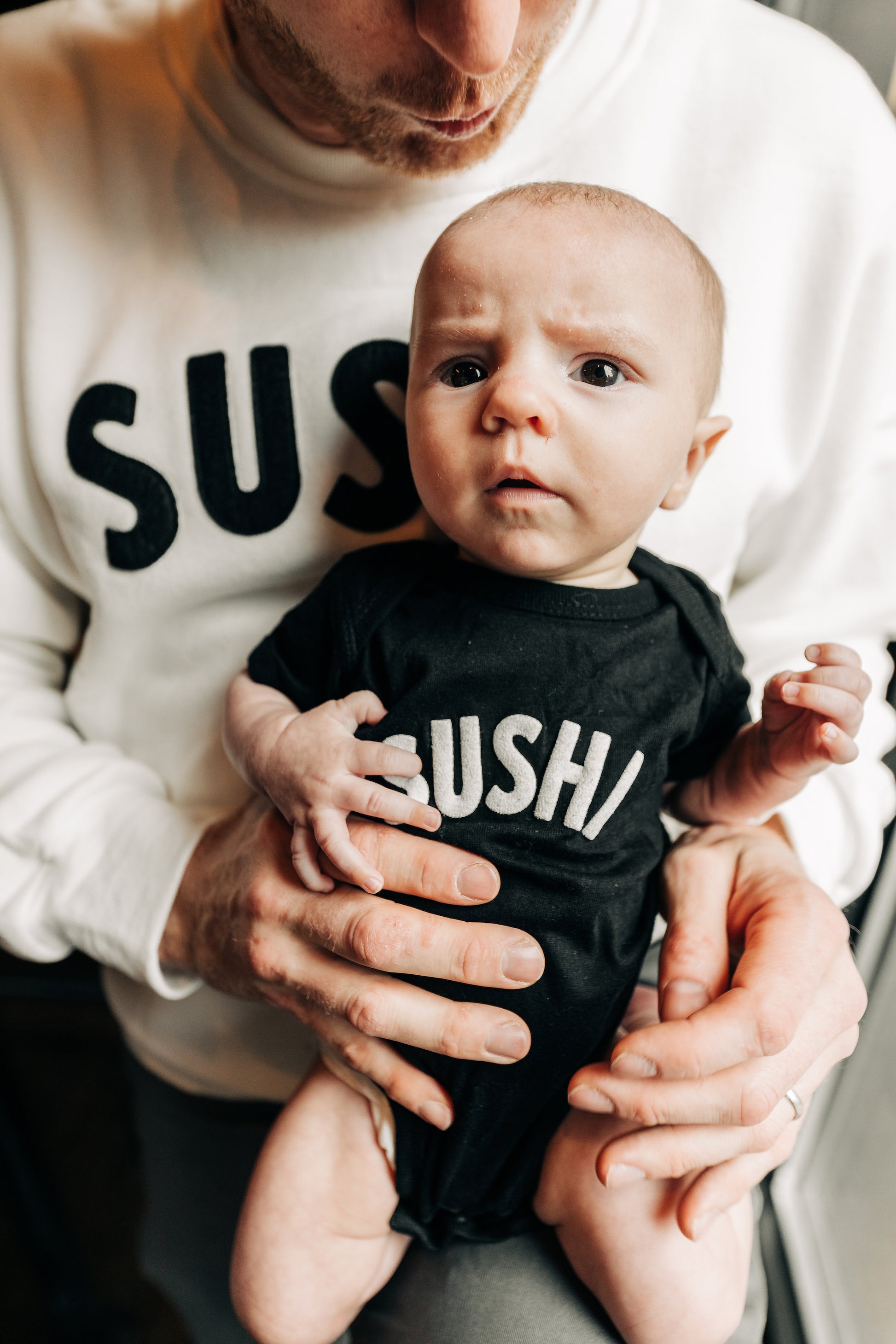 - Double-needle stitched ribbed binding on lap shoulder neck, shoulders, sleeves and leg openings